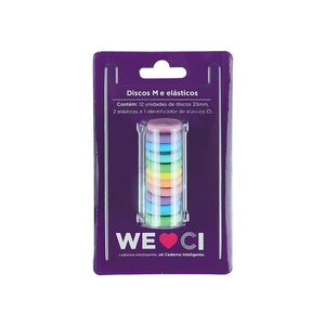 Cada kit inclui 12 discos, 2 elásticos e 1 identificador C, permitindo-te atualizar o visual do teu caderno de forma prática e simples.